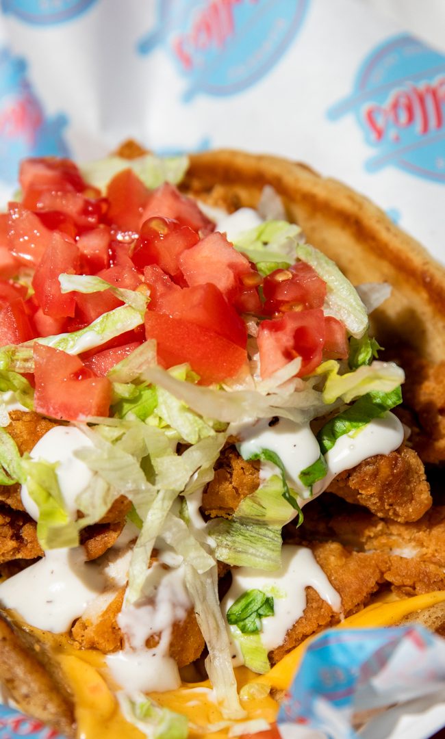 Golden fries, smothered in melted American cheese, savory bacon bits, crispy chicken, and topped with fresh lettuce and tomatoes, all generously drizzled with our house-made ranch.