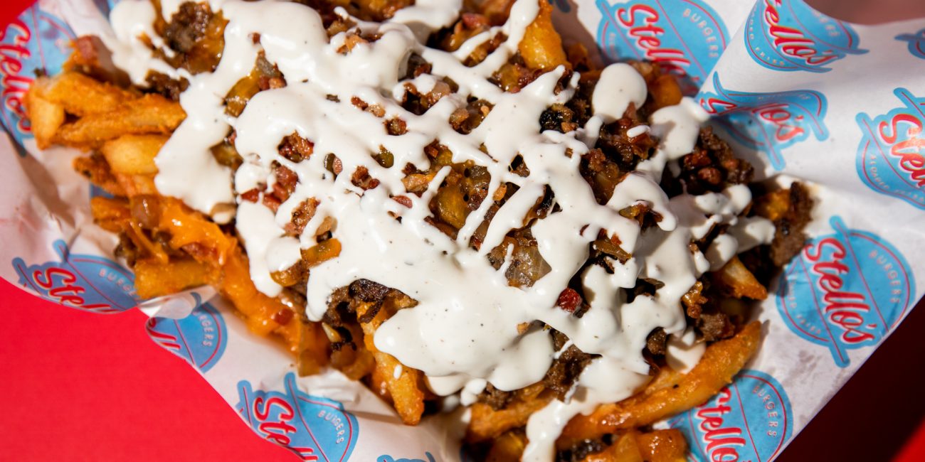Topped with caramelized onions, two slices of American cheese, crispy bacon, and our signature Stello sauce.